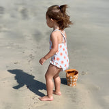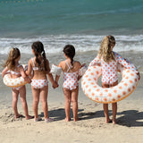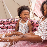 Dive into style with our All Over Girls One Piece Swimwear, offering UPF50+ protection for safe sun adventures. Crafted from high-quality stretch fabric, these swimsuits feature trendy crossed back designs and vibrant prints. Perfect for active days, they ensure comfort and durability. Available in smaller sizes with snap closures for easy dressing, our swimwear is made in the Netherlands, combining quality craftsmanship with fashionable designs. Let your child shine bright under the sun with playful patterns and colors.