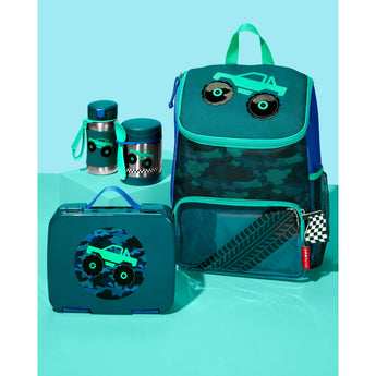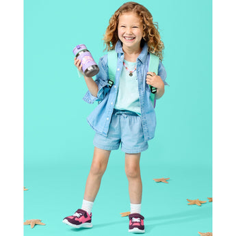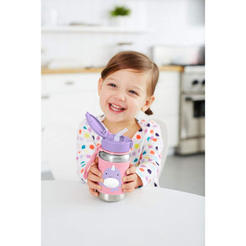Our kids stainless steel water bottle has a no-slip silicone sleeve to protect little hands from cold surfaces. Featuring our signature Skip Hop Zoo characters, it has a handy grab-me strap that attaches to anything, along with a pop-up lid so the flexible straw stays clean.