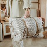 The Bloom Moon Organic Babymat is a versatile 3-in-1 playmat that transforms from a cozy lounger to a spacious play area. Made from 100% organic cotton and filled with eco-friendly recycled PET, it offers a safe and comfortable space for your baby. Lightweight and portable, it’s perfect for home or travel, providing a familiar environment for your little one.