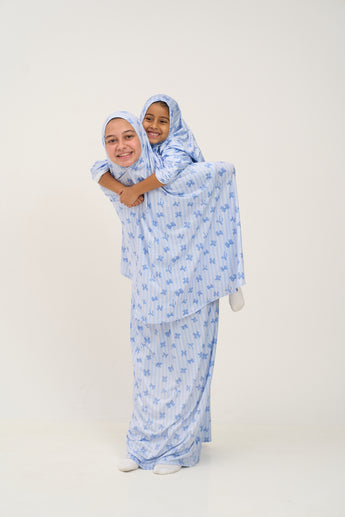 Girls Prayer Set-Blue Bow is a beautifully designed Ramadan prayer outfit, created to offer comfort, modesty, and ease during prayer.Crafted from Jersey Stretch, this piece feels soft, breathable, and gentle on the skin, making it ideal for daily prayers throughout Ramadan. The Blue tones add a calm, graceful touch while remaining practical and timeless.This Bow girl set is thoughtfully designed for ease of movement and modest coverage. A soft and colorful praying set to help Girls pray comfortably and in style. There is also a mother matching set available.