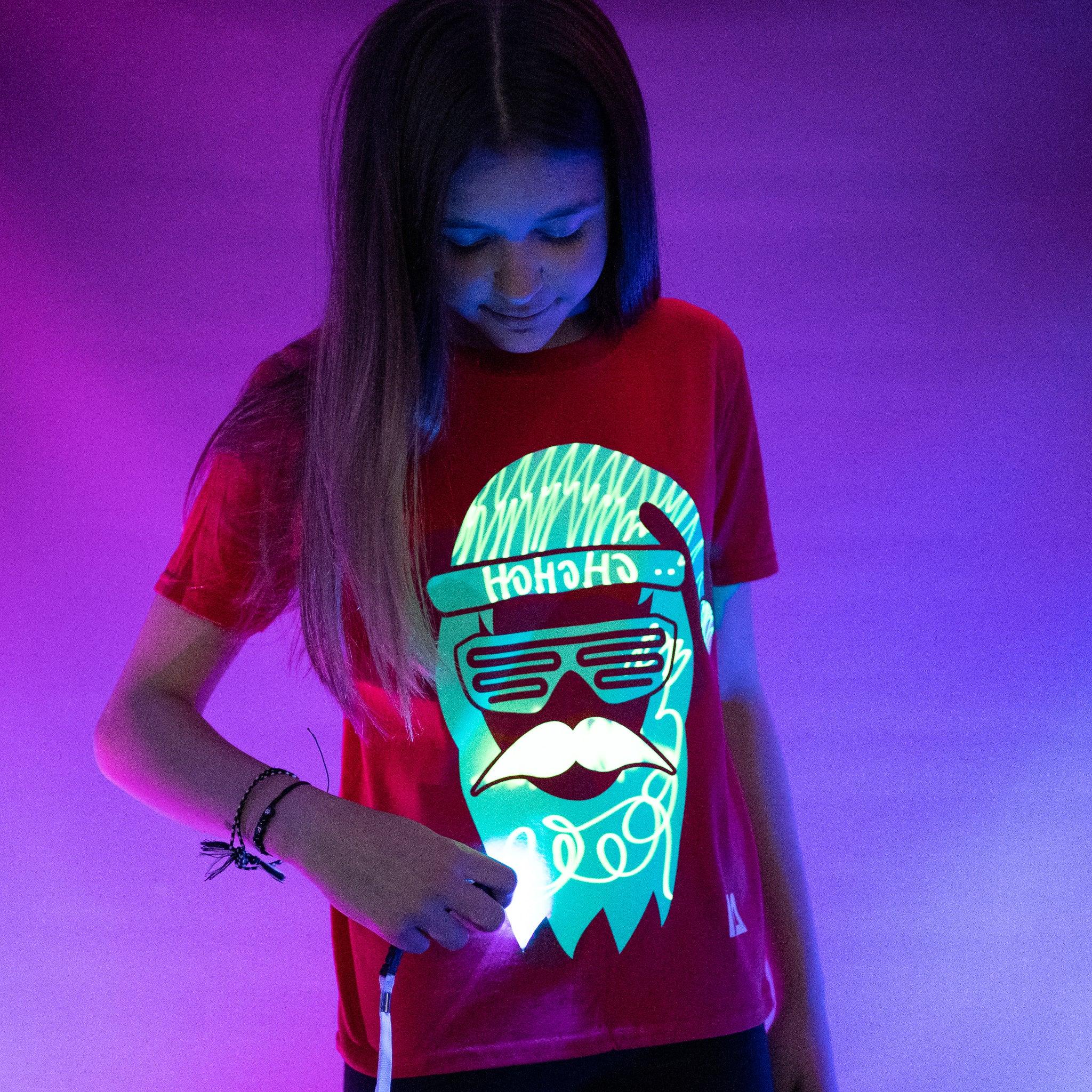 Discover the magic of the holiday season with our Glow in the Dark Christmas T-shirt! Perfect for kids who love both fashion and creativity, this T-shirt transforms into a glowing masterpiece with each use of the glow torch. Let your child’s imagination shine bright, as they draw and create fun designs that light up the night. Made from 100% cotton and machine washable, it's a delightful and practical addition to any festive wardrobe.