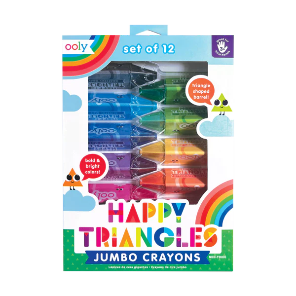 Discover the Happy Triangles Jumbo Crayons - Set of 12 by OOLY. Happy triangle crayons make happy hands Little hands aren't always ready for regular crayons with their skinny size and tubular shape. That's what makes this set of hard to break jumbo crayons so awesome! They're big, so small hands can grasp them more easily. They're also triangular, so they're easy to hold on to and they won't roll off tables. A kiddo's crayon bin is often filled with crayons broken in half, or worse, into itty...
