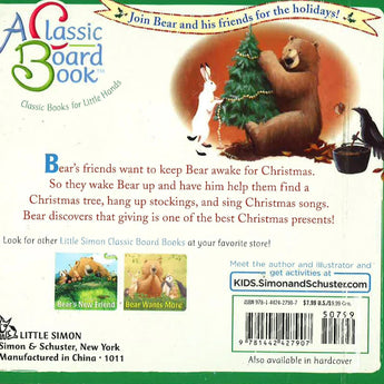 Bear’s friends are determined to keep Bear awake for Christmas! So they wake Bear up and have him help them find a Christmas tree, bake cakes, hang up stockings, and sing Christmas songs. Bear stays up—by discovering that giving is one of the best Christmas presents of all!