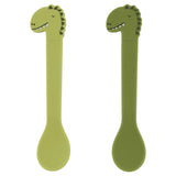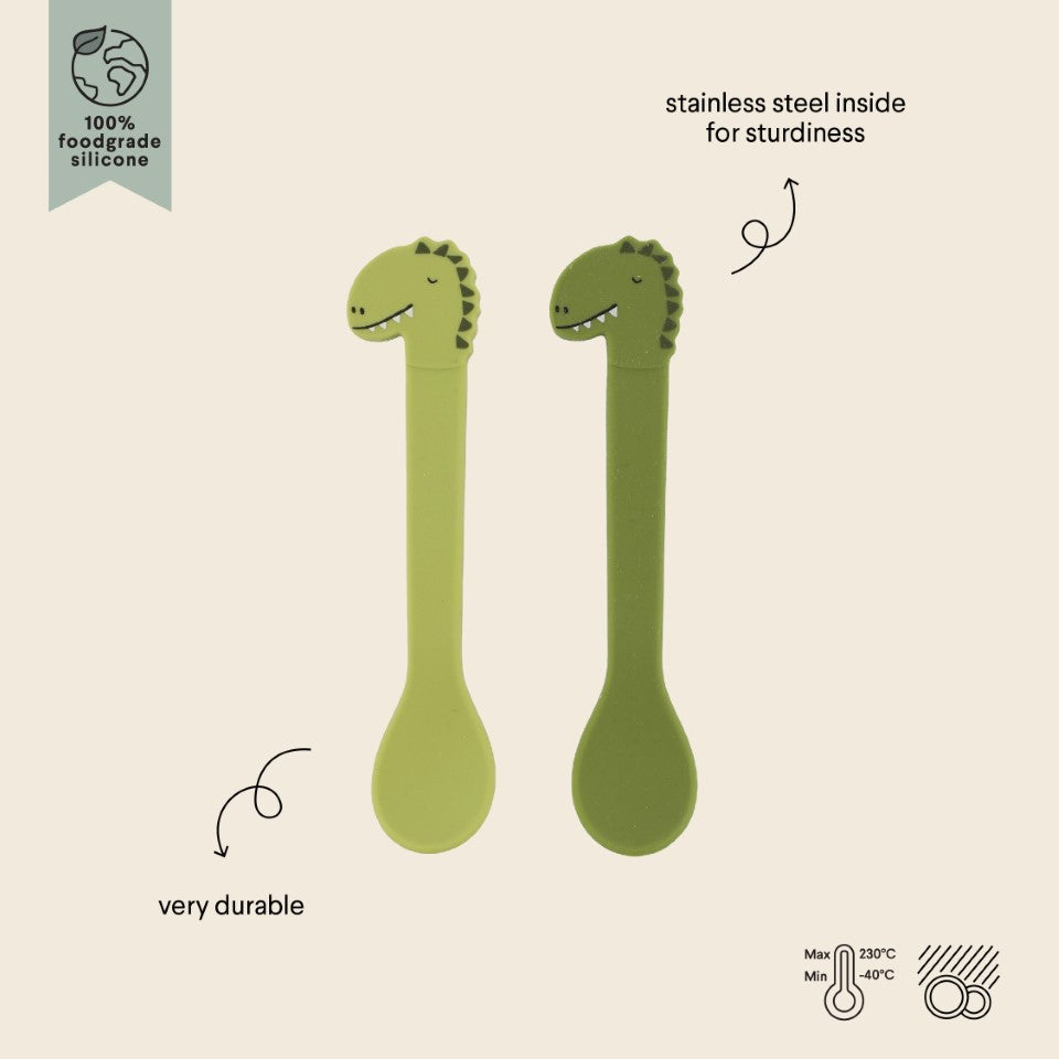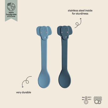 Two colourful spoons with a friendly face to enjoy your meal! These are the ideal spoons to feed your child solid food. The spoons are also great for children who are learning to eat on their own. There is a stainless steel part integrated inside the spoon for sturdiness and to keep it straight. That is why this item is an exception to the rest of the silicone range and cannot be used in the microwave. Silicone is great for use in the kitchen. It does not break and is safe to use in the microwave, dishwasher, freezer and oven. Even with intensive use, the tableware will stay in good shape and can easily be passed down to little brothers, sisters or friends. The 100% food grade silicone complies with all European safety standards.