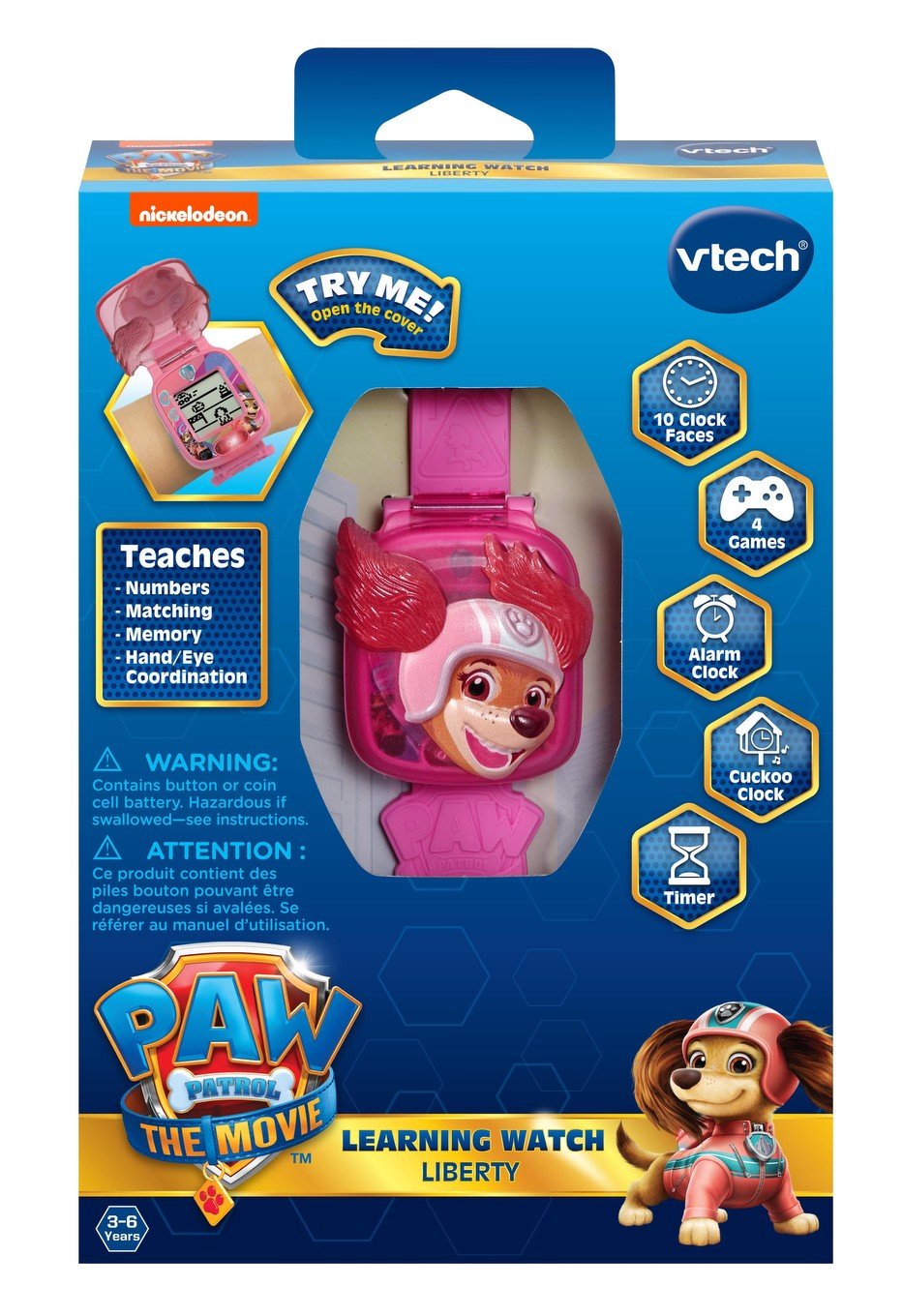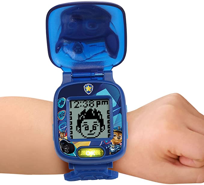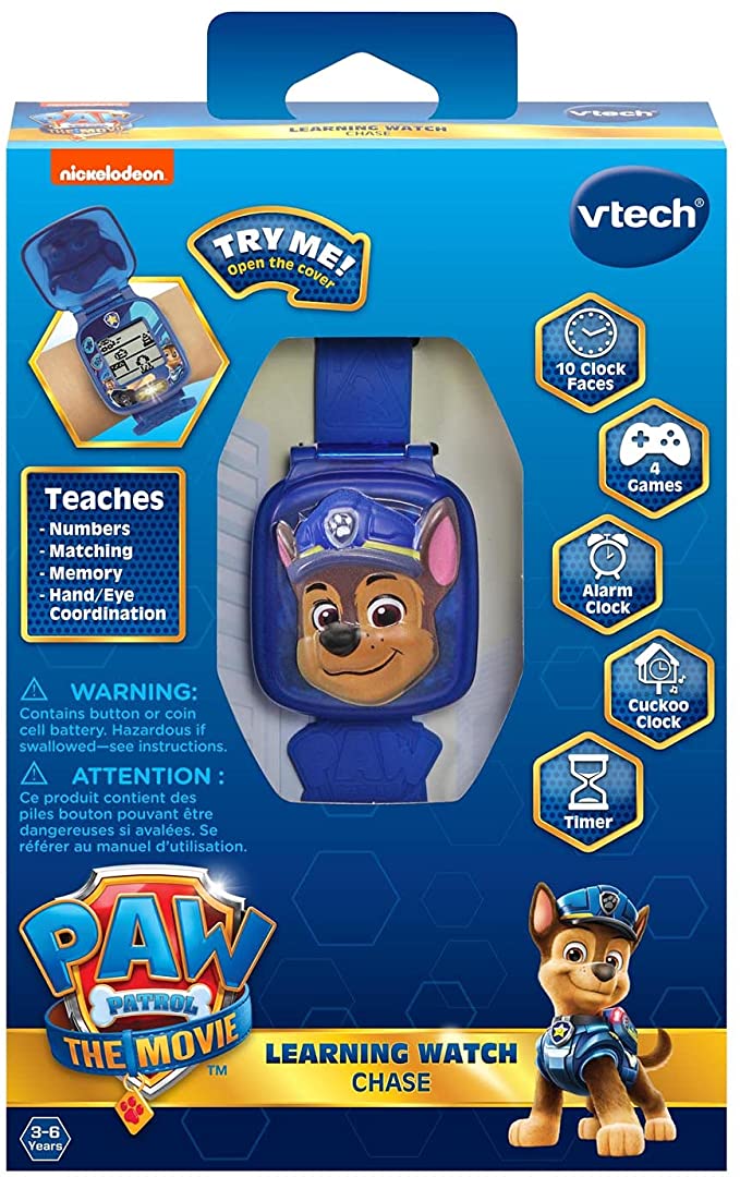 This interactive PAW Patrol learning watch for kids aged 3–6 tells time and includes alarm, timer, and stopwatch, plus four games that build math, memory, problem-solving, and coordination skills with fun digital clock faces, character voice, and light.