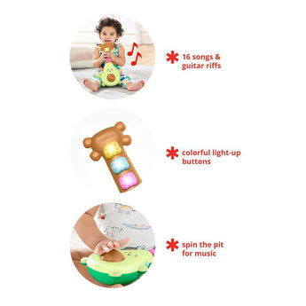 A little bit country and totally guac & roll! This adorable avocado guitar inspires mini musicians with strumming riffs, fun tunes and more! Easy for little hands to hold—just spin the avocado’s “pit” or press the light-up buttons and guac out!