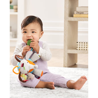 Squeak, crinkle, teethe & play! Little hands stay active with this colourful character as baby explores patterns, textures and sounds. Ideal for fun at home or on-the go, this cute companion rattles, crinkles and has a soft bandana teether for multi-sensory play. BPA, PVC and Phthalate free Skip Hop products make parenting more fun and bring innovative design to the littlest details. Skip Hop is for parents who appreciate better products that help improve their busy lives. from 0+.Attaches to stroller car seat or infant carrier