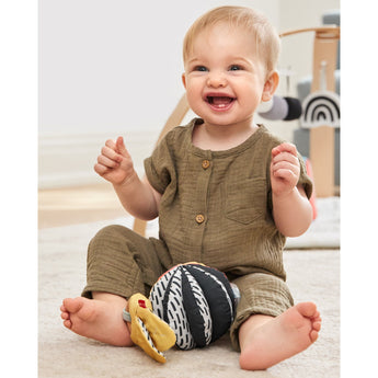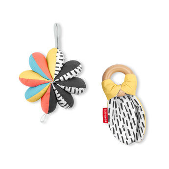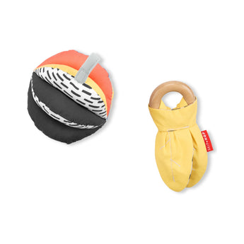 Designed in collaboration with experts in Montessori education, our Discoverosity 3-in-1 Baby Toy encourages visual stimulation, motor skills and more—at home and on the go. The two-piece toy lets you use each item separately or connect them together for three different ways to play. The soft rattle ball features a high contrast pattern on one side & bright colors on the other, while the sustainably- source wooden ring with solid & black & white patterned fabric is perfect for grasping and teething.