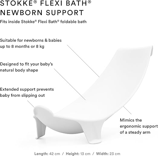 The Stokke Flexi Bath White Bundle includes the foldable Flexi Bath, a supportive newborn insert, and a sturdy stand, offering a complete, ergonomic, and space-saving bathing solution. Perfect for newborns and toddlers, it ensures comfort and safety during every bath.