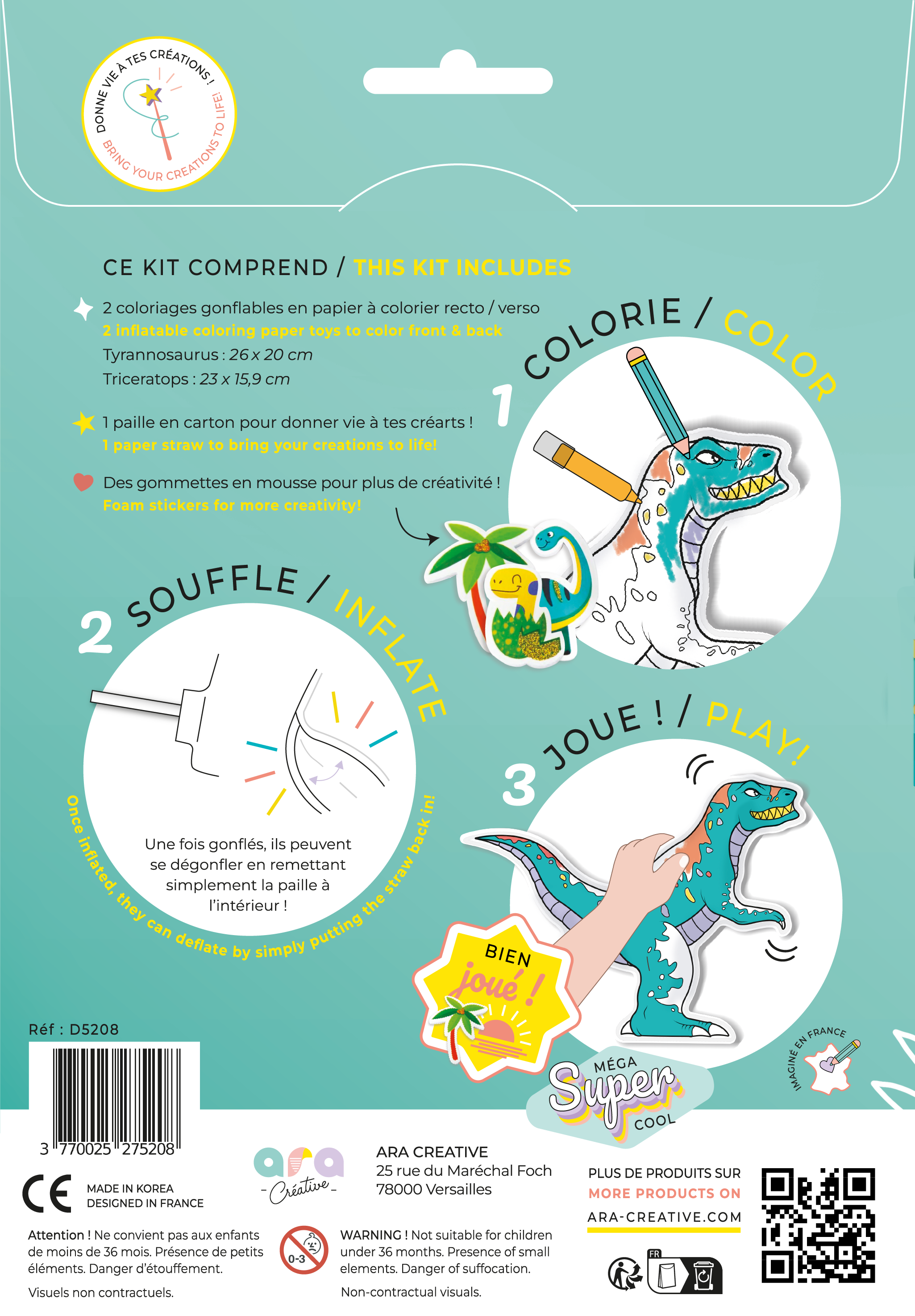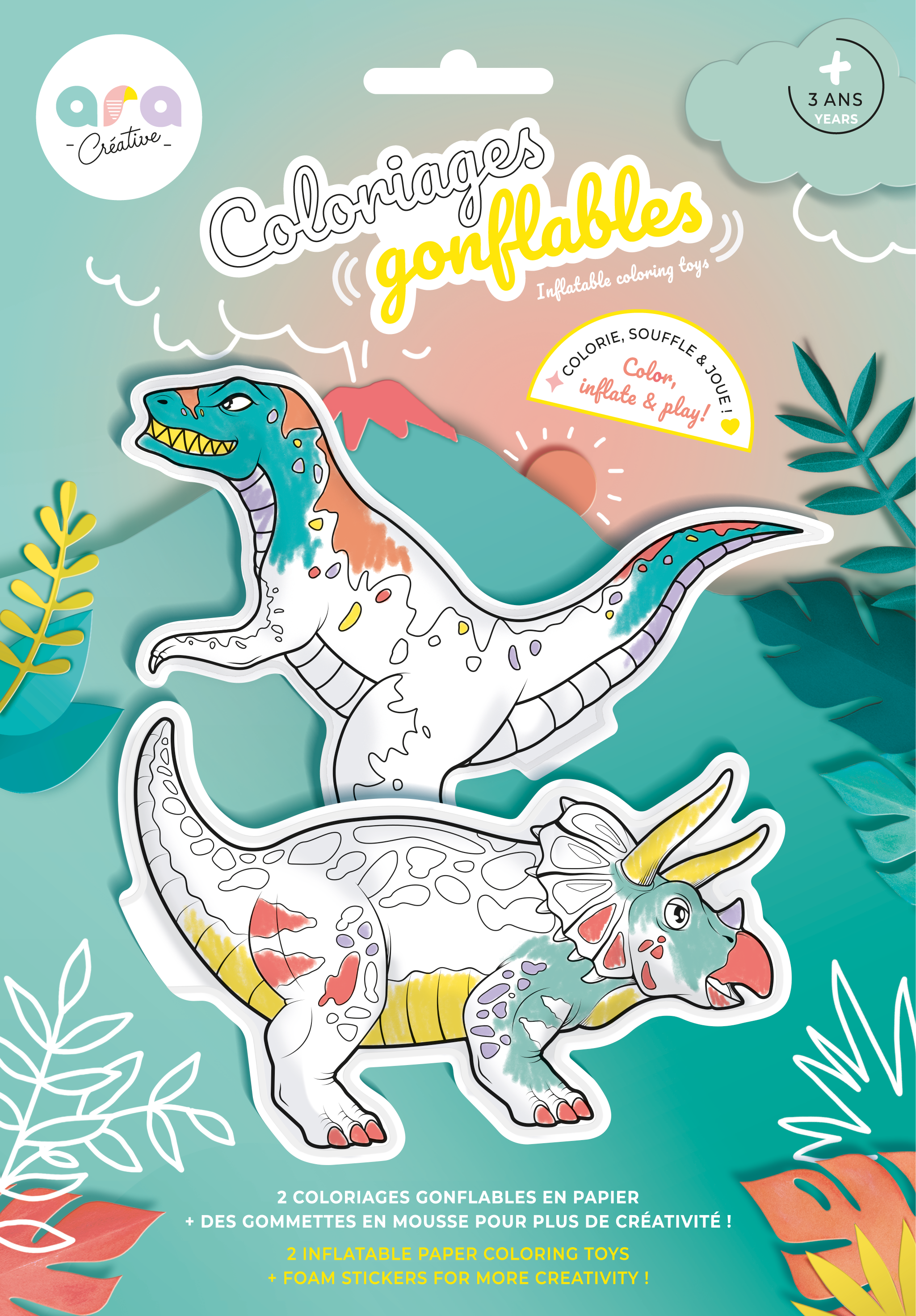 Colour dinos! The Ara Creative Inflatable Coloring Dinos lets kids colour and inflate dinosaur characters for creative play. Ara Creative designed this prehistoric craft for dino-loving kids. This Ara Creative set brings dinosaurs to life through colouring, inflating and playing with personalised dino creations.