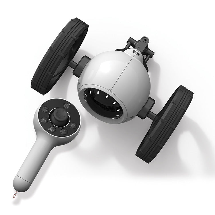 • One-handed remote control includes a joystick and buttons to control the movement of the vehicle