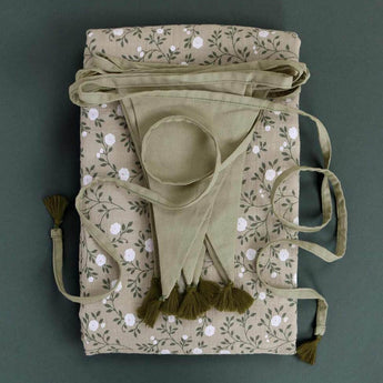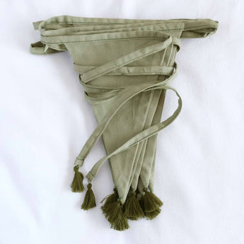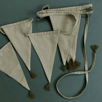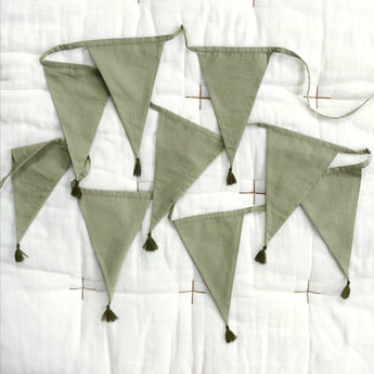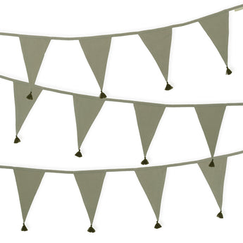 Soft green coloured garlands of 4 meters, made of 100% cotton. The 12 classic flags are finished with small tassels at the points. Ideally used to decorate the kids room, as decoration for birthdays or weddings.