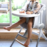 Height-adjustable highchair suitable for various table heights.