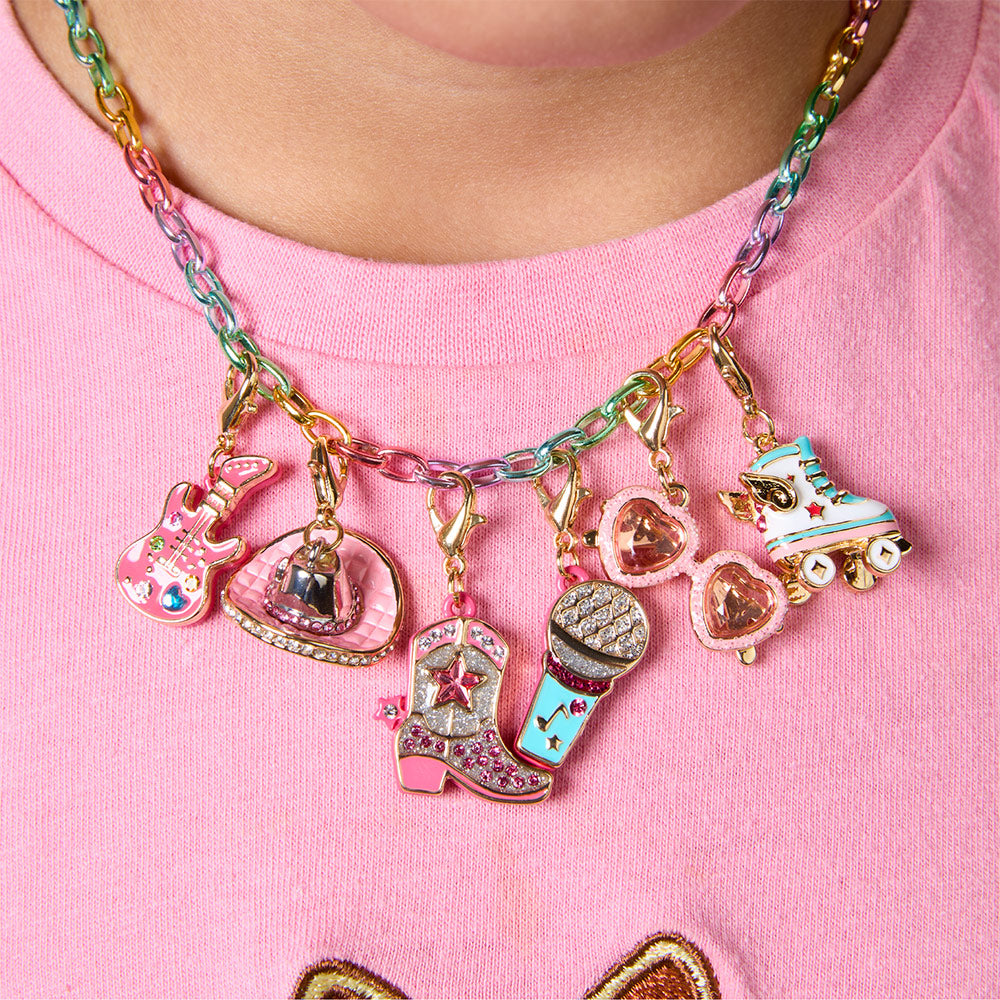 Bring the glam and the giddy-up with the FAO Schwarz® Charm Squad Cowboy Boot Charm. This bold little boot features glittery enamel, sparkly rhinestone accents, and major Western vibes. Clip it onto your bracelet, necklace, or anywhere you accessorise to show off your style, start your collection, or trade with your bestie. Whether you're feeling full cowgirl or just adding a little yeehaw energy to your stack, this charm is a total stand out.