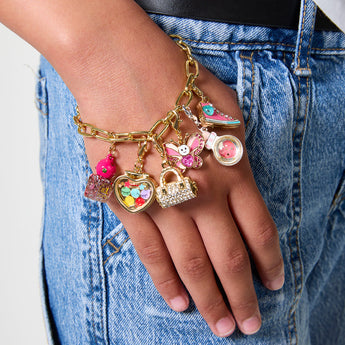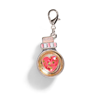 Unlock a little sparkle and mystery with the FAO Schwarz® Charm Squad Magic Bottle Charm. Designed with a floating glitter heart, golden confetti, and a candy-striped pink topper, this potion-inspired piece feels straight out of a fairytale. Whether you're building a stack full of dreamy vibes or gifting it to someone magical, this charm is pure wonder in miniature. A must-have for anyone who believes in a little everyday enchantment.