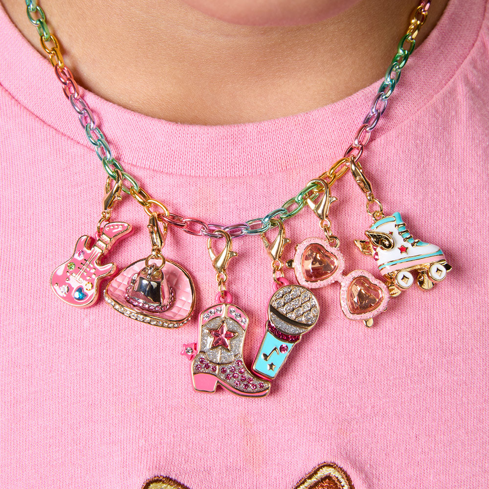Hit all the right notes with the FAO Schwarz® Charm Squad Microphone Charm. Designed with a gem-studded mic top, glittery accents, and pastel enamel with music note details, this charm is made for center stage. It’s a total vibe for singers, dreamers, and anyone who loves to shine. Add it to your bracelet or necklace to turn up the volume on your charm stack.