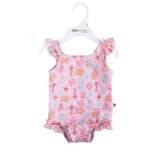 Baby swimsuit and matching sun hat set for infants and toddlers—fun, safe, and easy to use. Soft, quick-dry fabric, full lining and snap closure for simple diaper changes. UPF 50+ sun protection keeps little ones comfortable and protected.