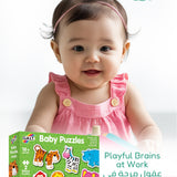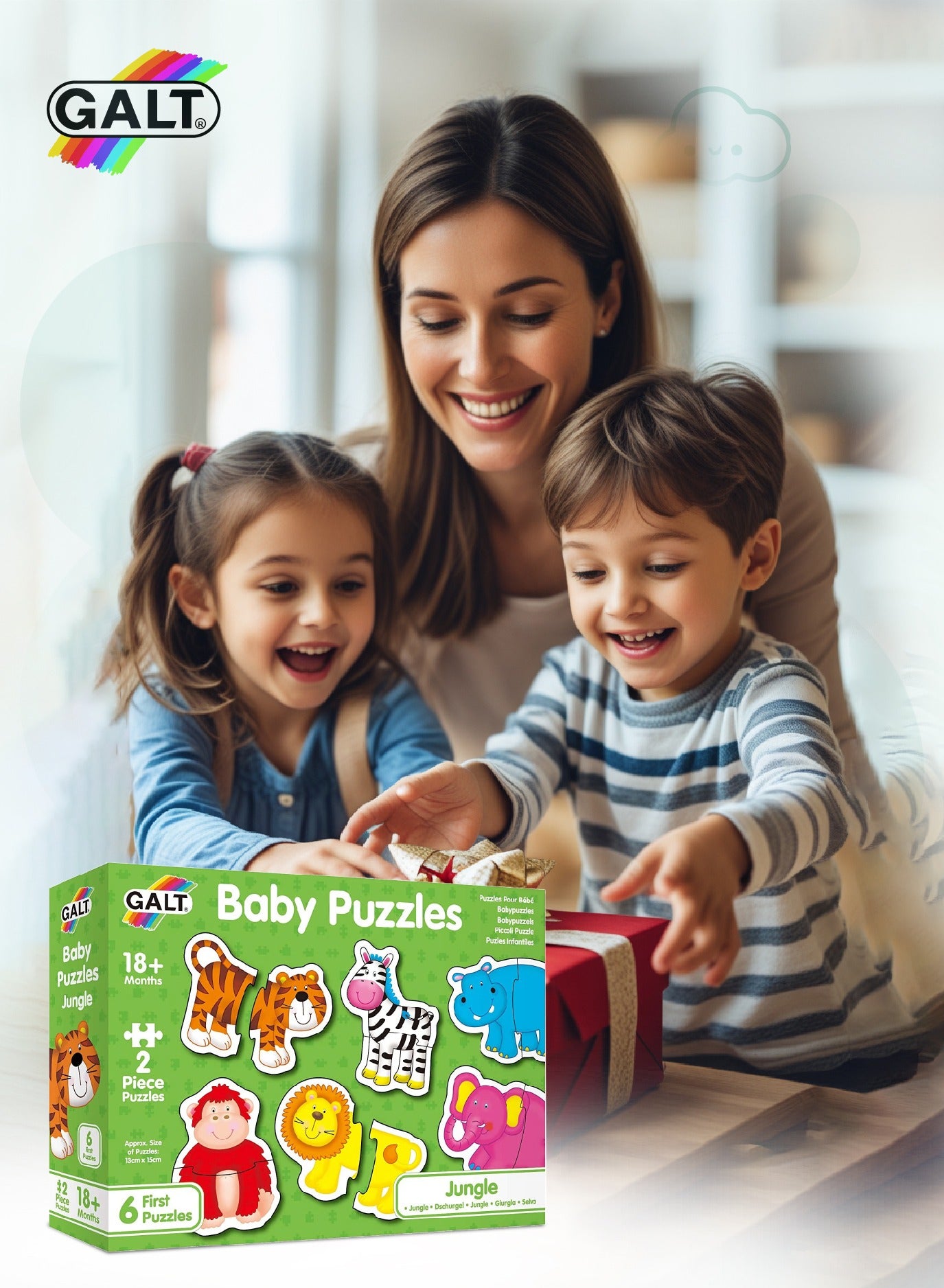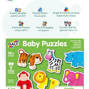 Designed for toddlers aged 18 months+, the Baby Puzzles Jungle set includes 6 vibrant and chunky 2-piece animal puzzles. Perfect for developing hand-eye coordination.