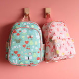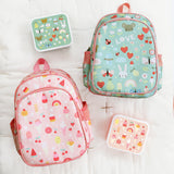Lovely lightweight kids backpack with an insulated front pocket that ensures snacks and drinks stay cold (or warm). The front pocket easily fits a lunch box, drink bottle, and added snacks or fruit. The main compartment is large enough for all your school essentials. There is also an additional smaller pocket inside and two open drink bottle pockets on the sides. Thanks to the chest strap, the adjustable shoulder straps always stay in place. There is extra filling on the back panel, and it is has a breathable layer for extra comfort.