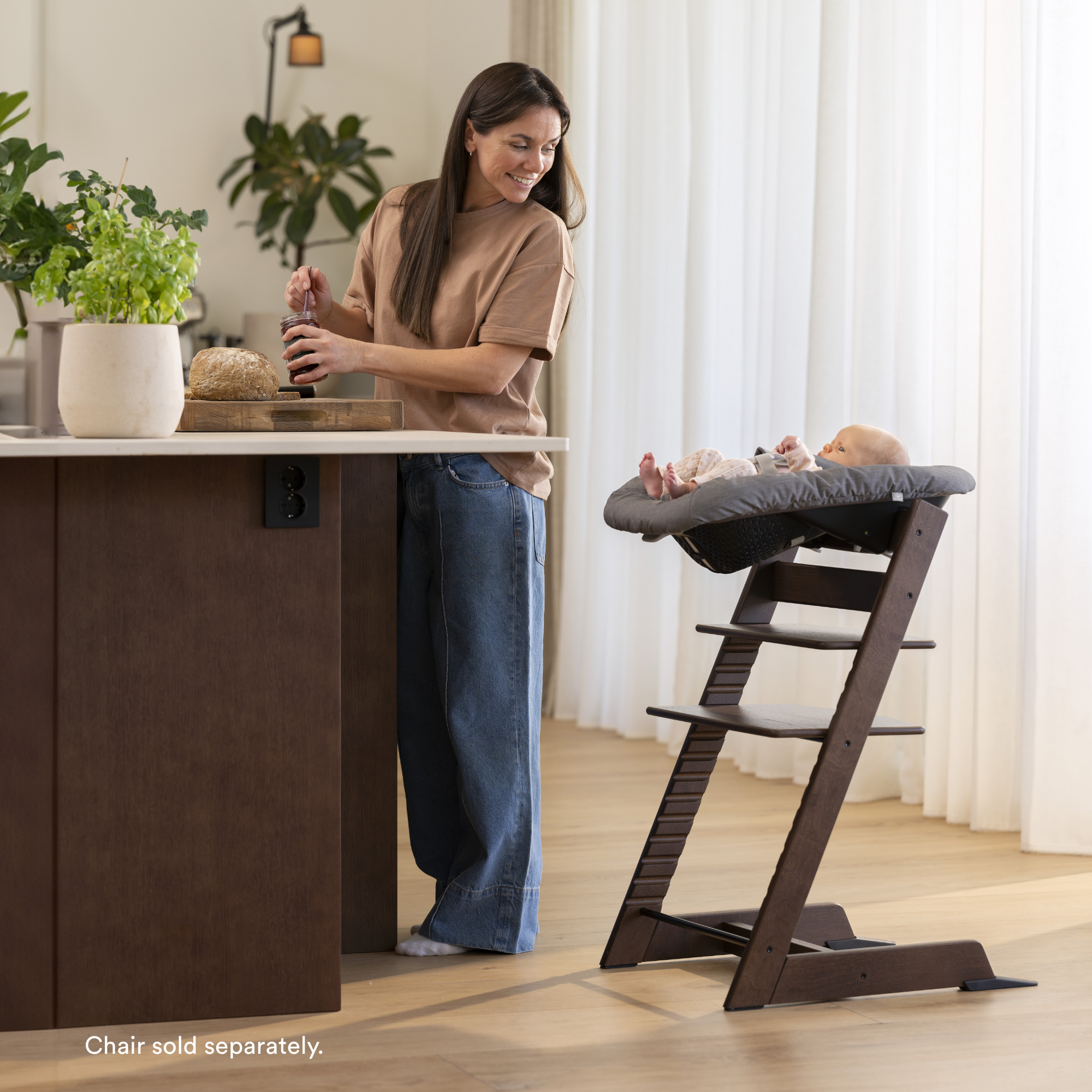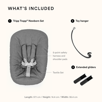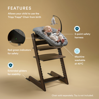 The Tripp Trapp® Newborn Set is designed to encourage bonding from the very beginning. Comfortable and ergonomic, it cradles your newborn, lifting them to table height. Now with 2 angle adjustable positions and excellent leg support, your little one is assured a cozy, nest-like environment they are sure to enjoy. This enables eye contact, promoting interaction during meals and gatherings around the table. It´s a great way to keep your baby close while building strong relationships with the whole family. Safe and simple to use, the Newborn Set can easily be attached and removed from the Tripp Trapp® chair. Red-green indicators reassure you that it is mounted correctly while a 5-point safety harness with protective shoulder pads keep baby extra secure. The toy hanger lets your little one keep their favorite toy close at hand to keep them entertained while helping to stimulate their evolving motor skills. Suitable from newborn up to 9kg.