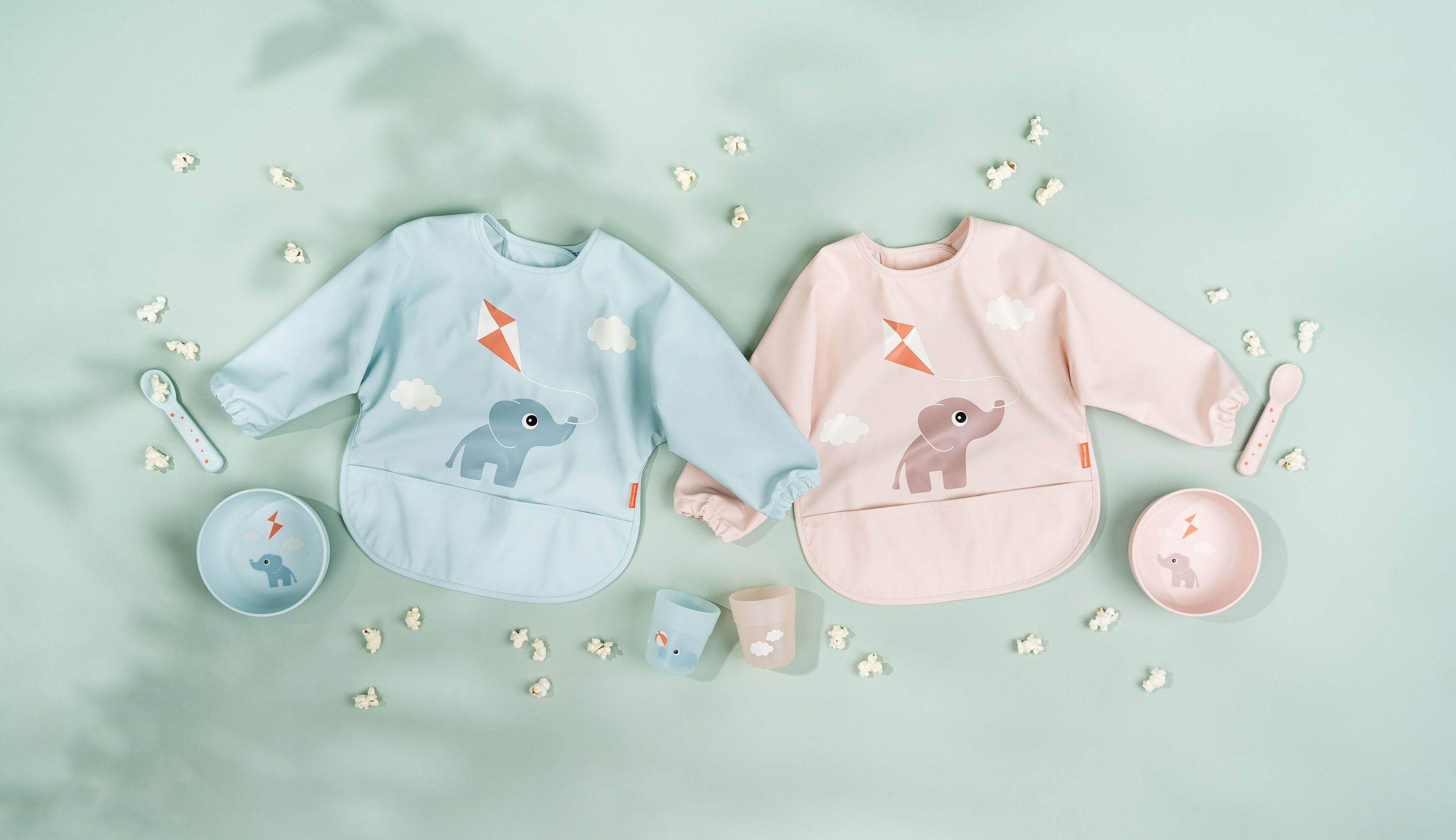 A first meal set in blue, featuring Elphee the elephant. Includes a bowl with a suction base, a 2-handle cup with a removable spout lid, and a feeding spoon. Heat-resistant, microwave and dishwasher safe.