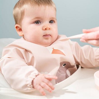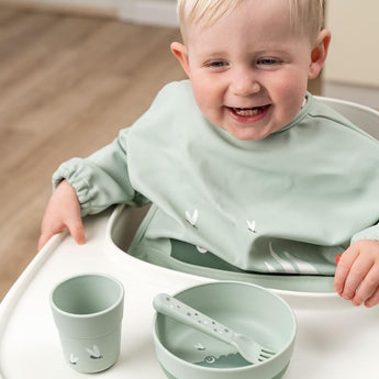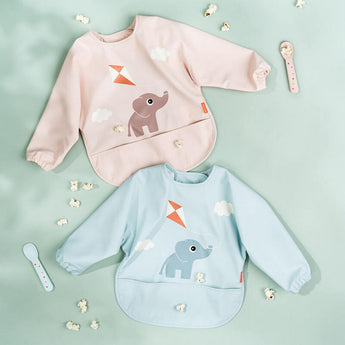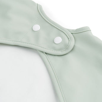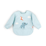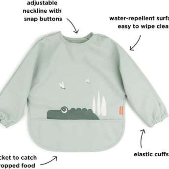 A waterproof bib in green, featuring Croco and Birdee designs. Elasticated sleeves and a front pocket to catch food. Adjustable neck closure and easy to wipe clean.