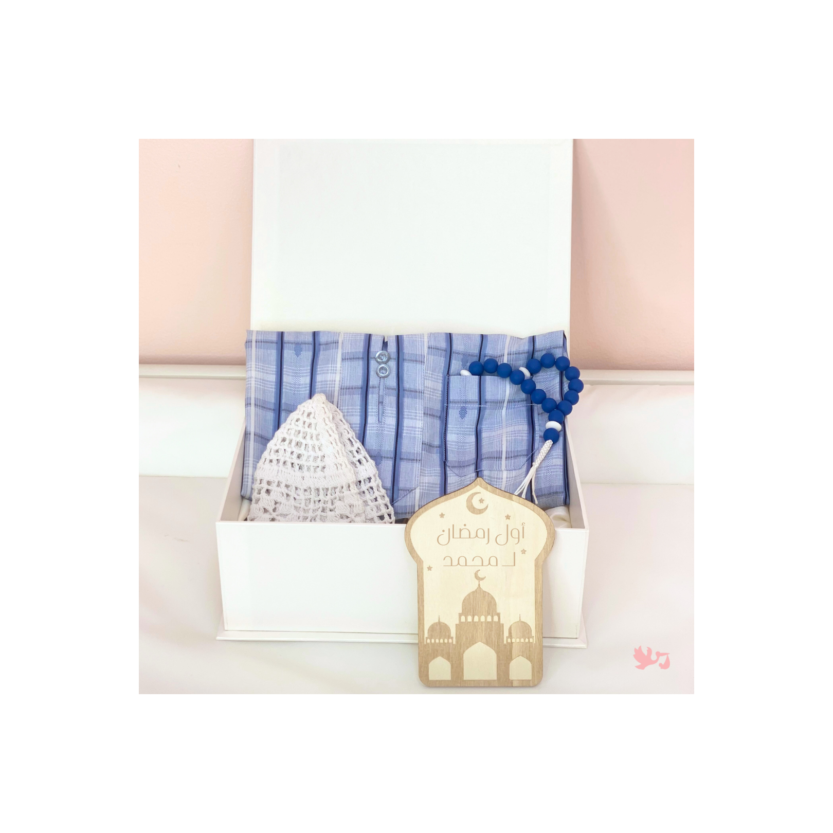 A beautifully curated Ramadan gift box designed to celebrate a baby’s first Ramadan with a traditional jalabiya and keepsake elements.