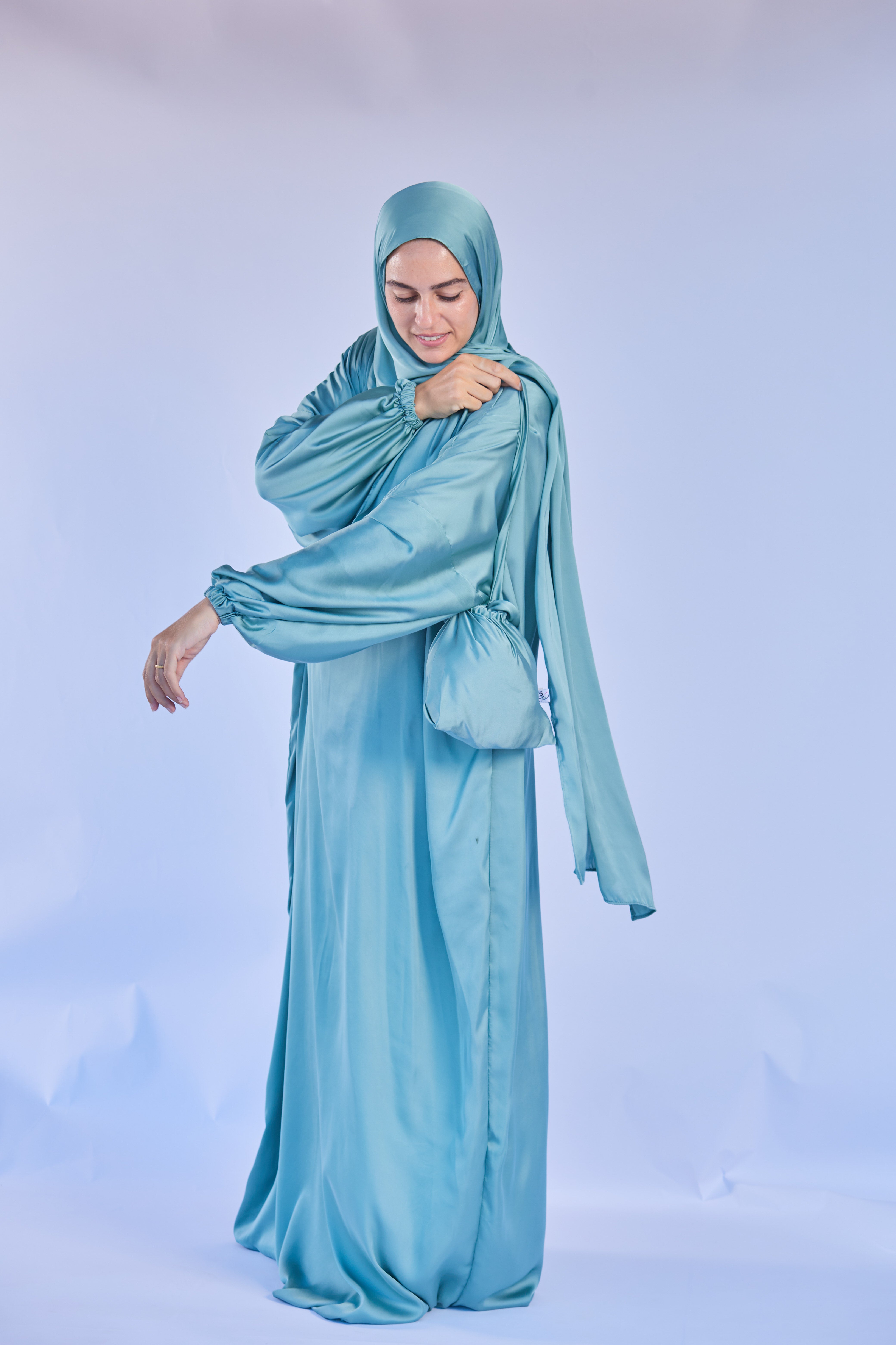 Discover the Elegant Adult Satin Prayer Clothes with Wrap-Around Scarf by Rouqei. Experience the elegance and comfort of our Adult Isdal Satin Prayer Clothes. This one-piece ensemble, featuring a wrap-around head scarf, offers a modest and graceful look for your spiritual practices. Made from soft satin, it ensures a comfortable fit with a convenient shoulder zipper for easy wear. Perfect for daily prayers or special occasions, this outfit combines tradition with modern style.