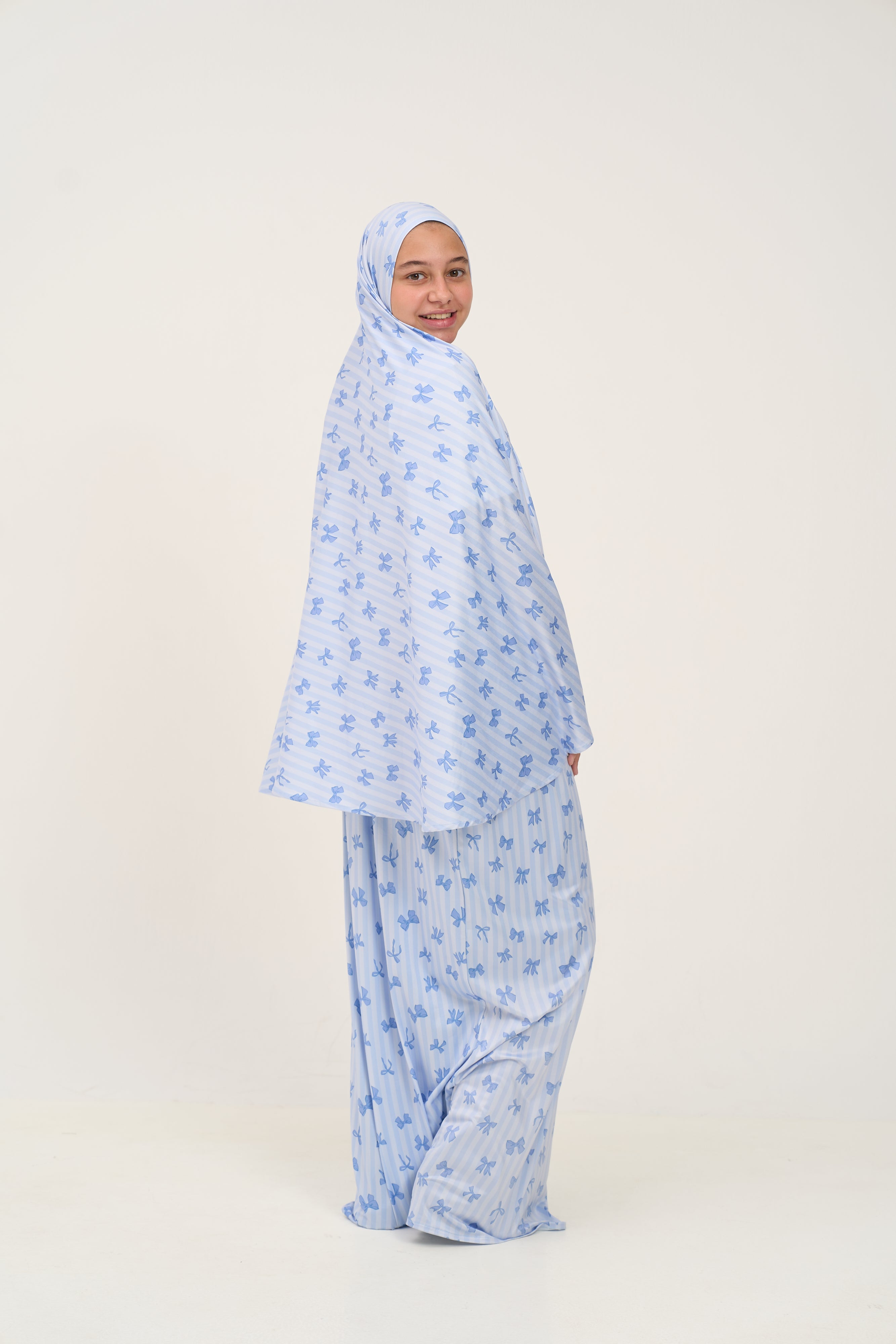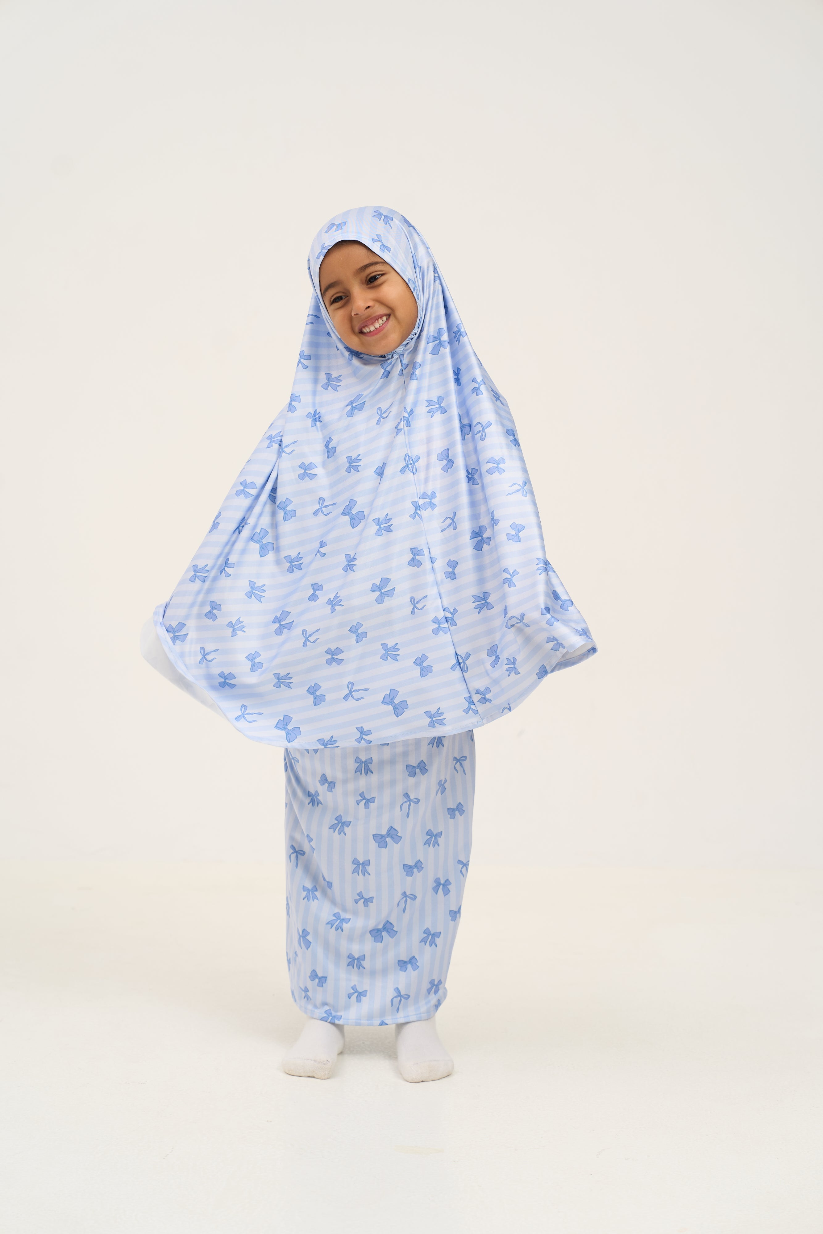 Bow-tiful prayers! The Rouqei Girls Prayer Set in Blue Bow features a charming prayer outfit with a sweet blue bow accent. Rouqei crafted this set for young girls who love feminine prayer wear. This Rouqei set makes prayer time special with a pretty blue bow detail girls will look forward to wearing.