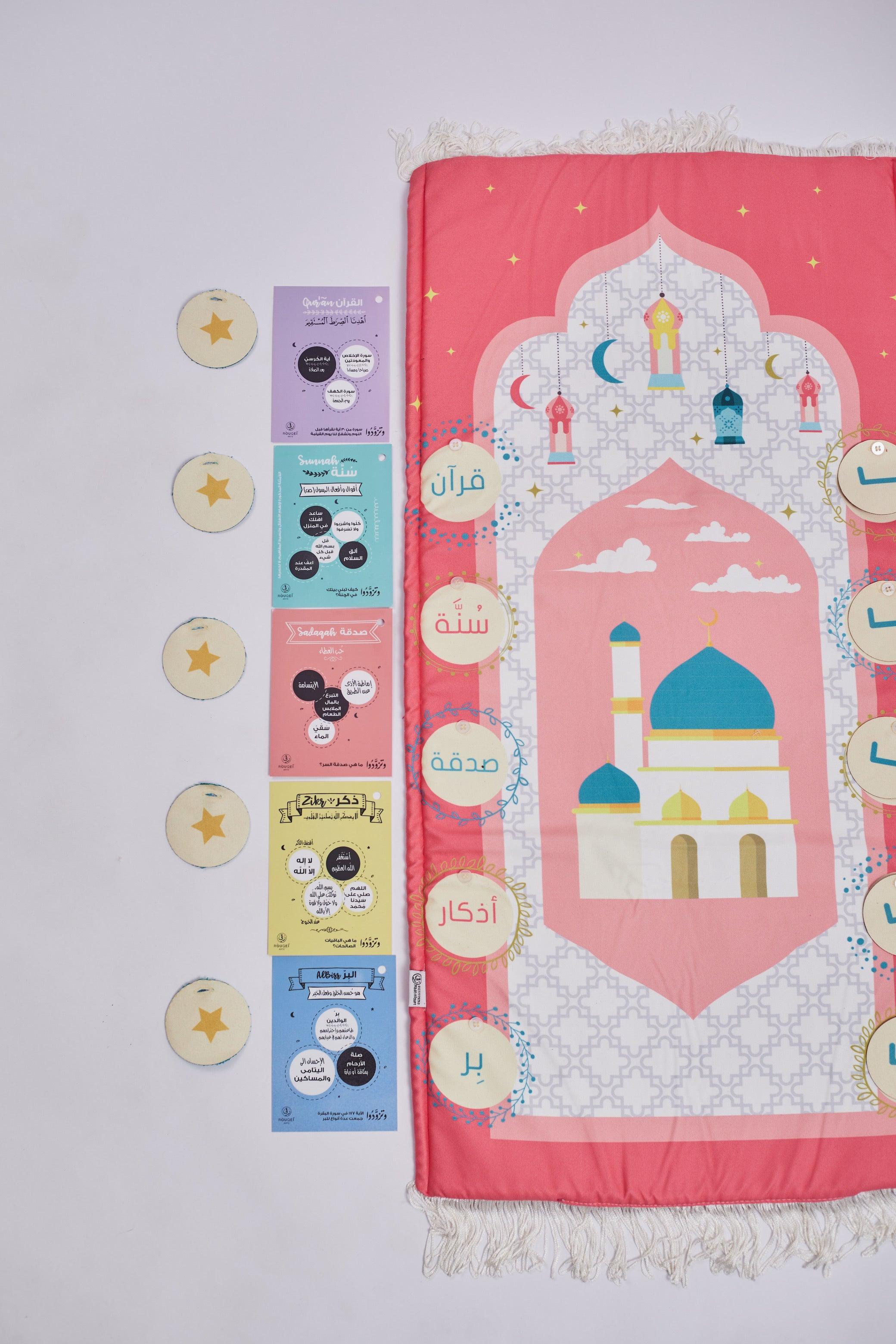 Discover the Padded Kids' Prayer Mat by Rouqei. Introducing a padded kids' prayer mat, designed specifically for tracking PRAYERS & GOOD DEEDS with button-able ticks and stars. This innovative prayer mat not only provides comfort during prayer but also engages children in their spiritual journey. The accompanying good deeds cards simplify the understanding of Quran, Sunnah, Sadaqah, Zikr, and Birr, making it easier for children to grasp these import