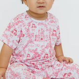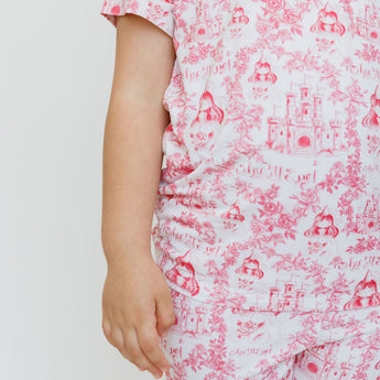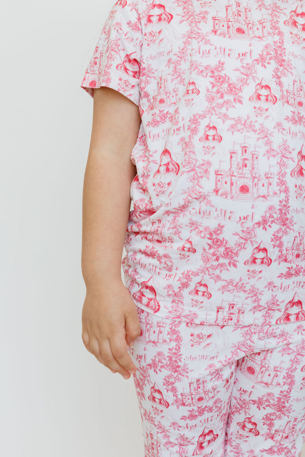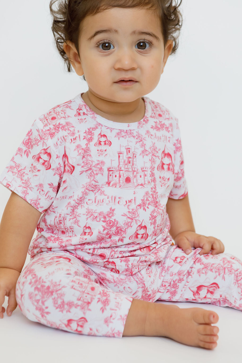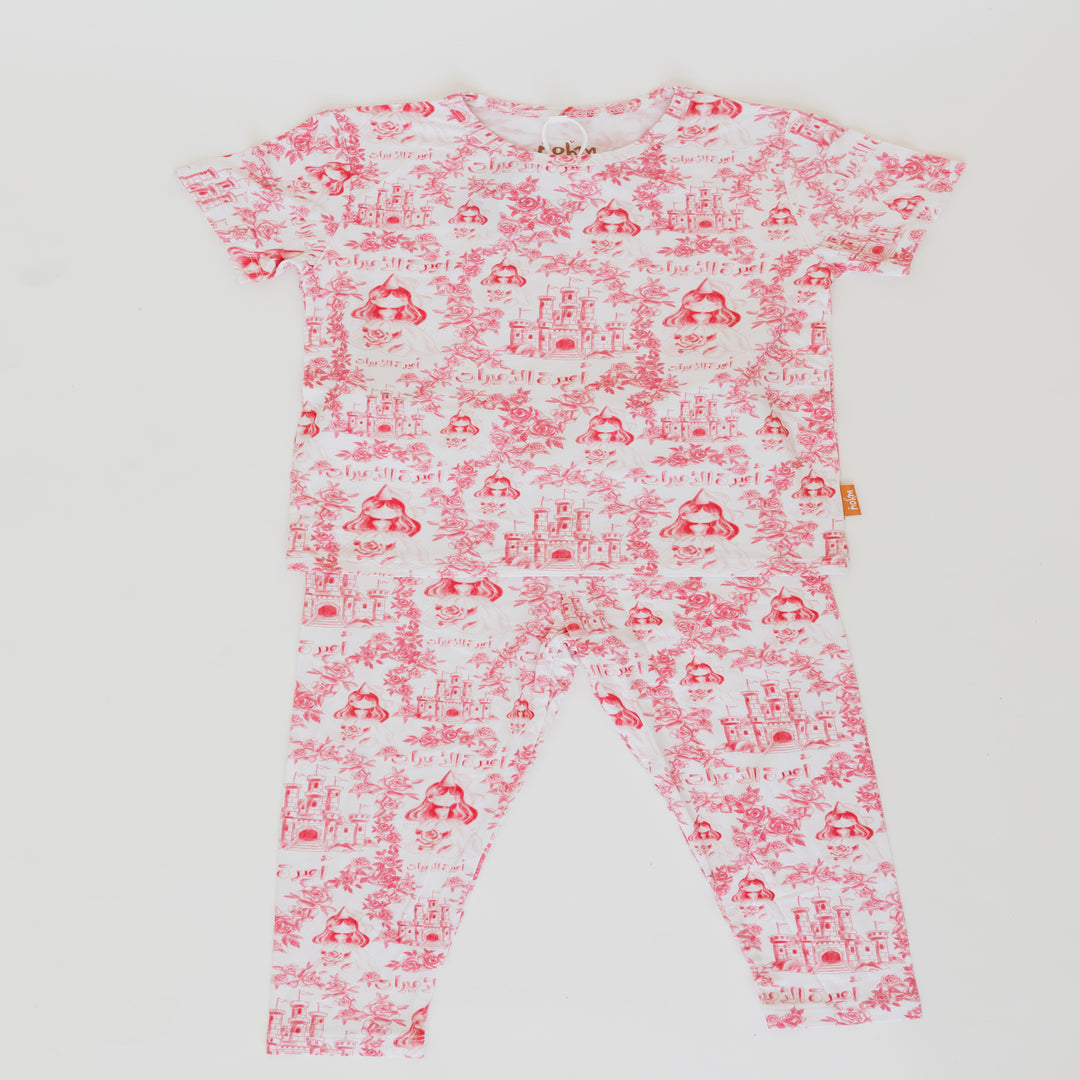 Amira, meaning "princess" in Arabic, is a short sleeve and pants set inspired by delicate flowers and princess themes. This enchanting, girly design will make your little one feel like royalty with print of castles, the traditional princesses in our region, and أميرة الأميرات.