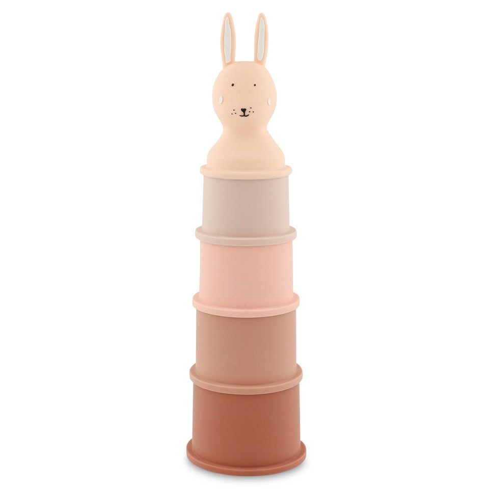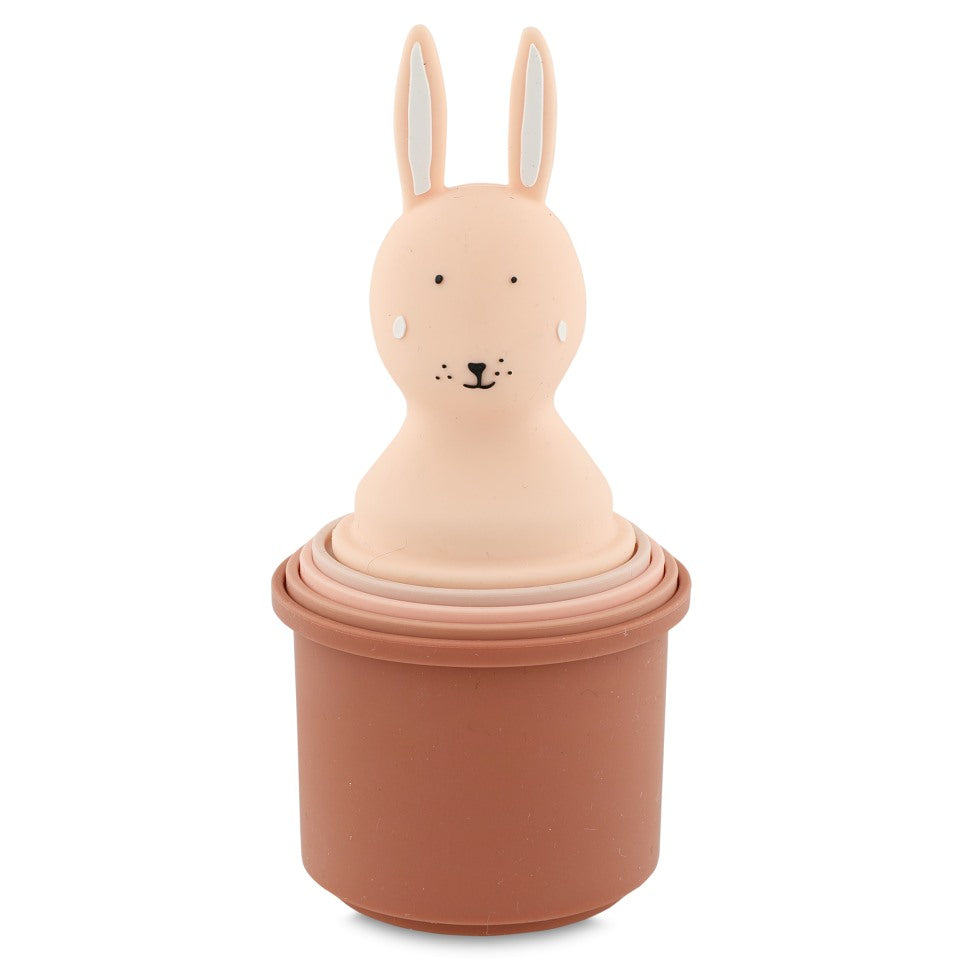 Higher…higher…whoops! The Trixie Stacking Cups are made from soft-touch silicone, beautifully coloured and cleverly shaped. Some have holes for water play, others are closed for filling and pouring. They double as sand moulds too! A versatile Trixie toy for bath time, beach days, and creative stacking play from 6 months.