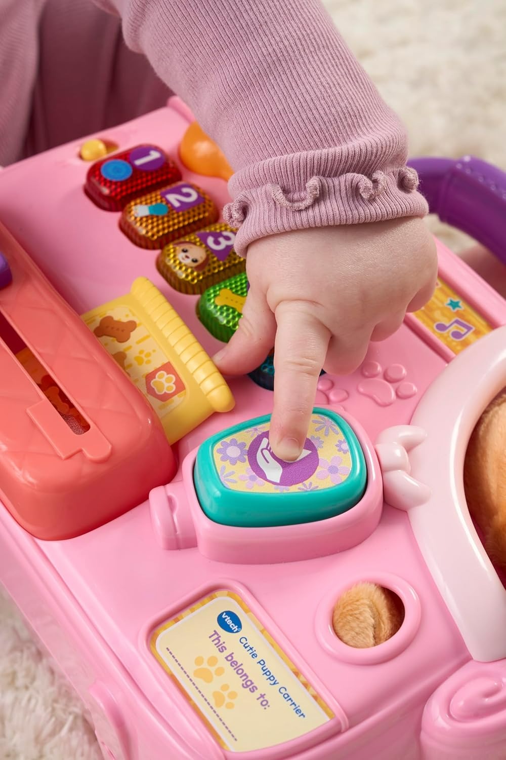 Puppy care! The VTech Baby Cutie Puppy Carrier is an interactive role play toy with a plush puppy and carrier. VTech designed this nurturing toy for babies who love pretend pet care. This VTech set teaches caring and empathy through interactive puppy sounds, songs and nurturing role play.