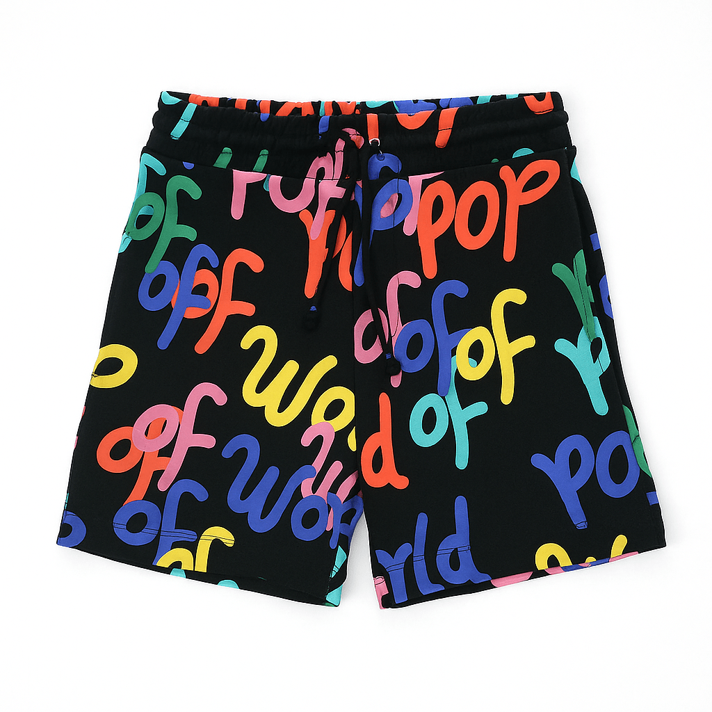 Black World Of Pop printed shorts for kids who love bold, playful style. The vibrant graphic print brings personality to any outfit while the comfortable fit keeps them moving all day. Perfect for active children who want to express their fun side.