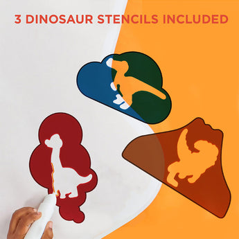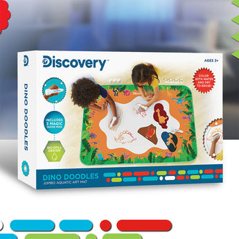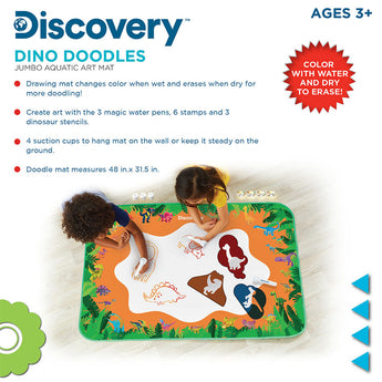 The Discovery Kids Dino Doodle Aquatic Art Mat allows kids to create art with 3 magic water pens, 6 stamps, 3 dinosaur stencils, and 1 sponge. The pens fill with water to create vibrant colours on the mat.