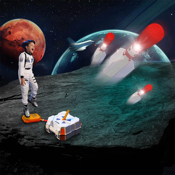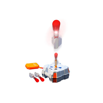 Reach for the stars with Space Race Blastoff! Unpack the mobile launch case. Prepare the blastoff and power on the rocket LEDs. Then, stomp the boot prints to send rockets soaring up to 75ft. (23m) -it's the fun way to learn about physics and rocket science!