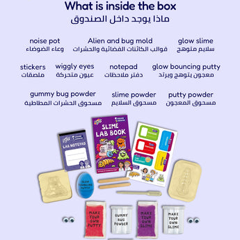Bright box packs everything: powders, molds, wiggly eyes, stickers and lab notebook. Wrap it for birthdays, Eid or holidays and spark squeals of delight. Add to cart now and let the ooze adventure begin!