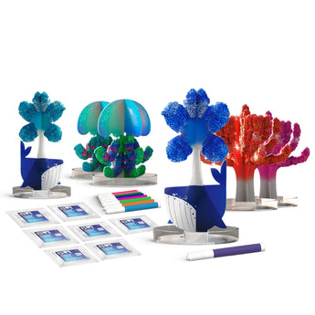 Explore the wonders of the ocean and the science of crystals with the Discovery™ #MINDBLOWN Crystal Sea Creations Chemistry Kit. This 32-piece all-inclusive set allows kids to color a coral, jellyfish, and whale, and then grow vibrant crystals on each one. The set comes with 8 Sea Creature Figures, 8 Trays, 8 Bags of Crystal Grow Solution, 8 Markers so you have everything you need to grow the Crystals