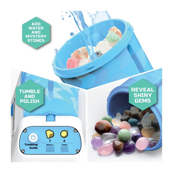 The Rock Tumbler Plus kit is beginner-friendly, coming with a bag of natural starter stones, medium and polish grit, and an illustrated tumbling guide to walk you through each step. The motorized tumbler is designed for ease of use, making it ideal for children interested in science, geology, or gemology.