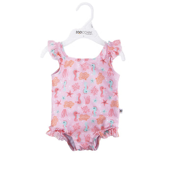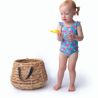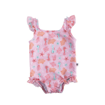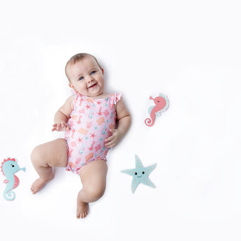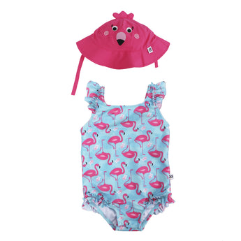 Baby swimsuit and matching sun hat set for infants and toddlers—fun, safe, and easy to use. Soft, quick-dry fabric, full lining and snap closure for simple diaper changes. UPF 50+ sun protection keeps little ones comfortable and protected.
