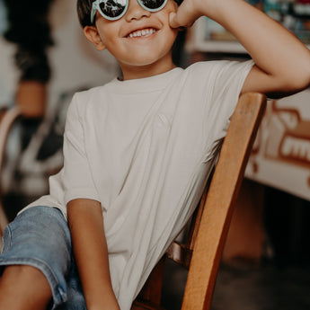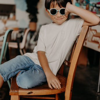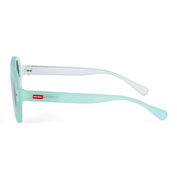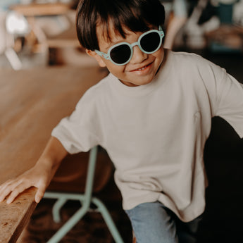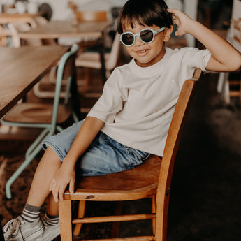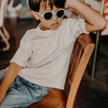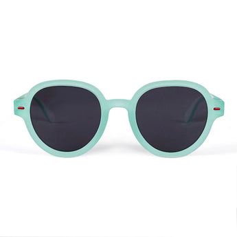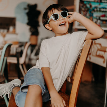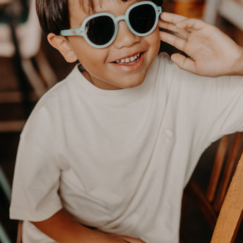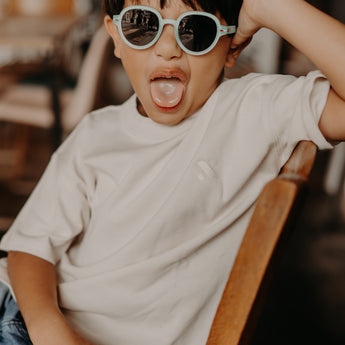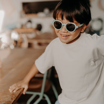 The Megy's collection children's sunglasses are a best-selling model. Not to miss. Round shape, trendy color, modern, stylish look, these sunglasses are made from recycled polycarbonate. Stylish sunglasses for children, just the way we like them. Ideal protection: UV400, Category 3 lenses, spring hinges.