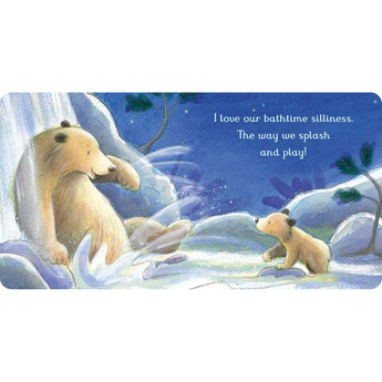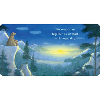 The sun rises, and a bear and cub begin their day together. They splash in the water, climb mountains, watch the colorful lights in the shimmering sky, and play with friends. They show their love for each other by touching noses, chasing each other, and, of course, hugging and snuggling before bed.