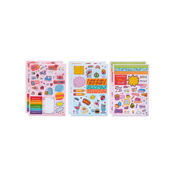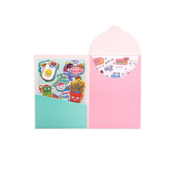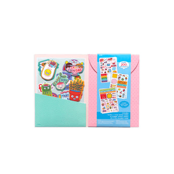 Quirky Fun Sticker Stash set of stickers is the perfect collection for planners, journals and decorating. Each set has 6 paper sticker sheets, 1 vinyl sticker sheet, 1 puffy sticker sheet plus a handy reusable folder for safe keeping. With over 200 delightful stickers featuring smile-bringing delicious donuts, fast food faves, and colorful office supplies, you will be able to fill your planner and more! Decorate the family calendar or share some of the fun with friends on a note or letter. Let your sticker fun begin!