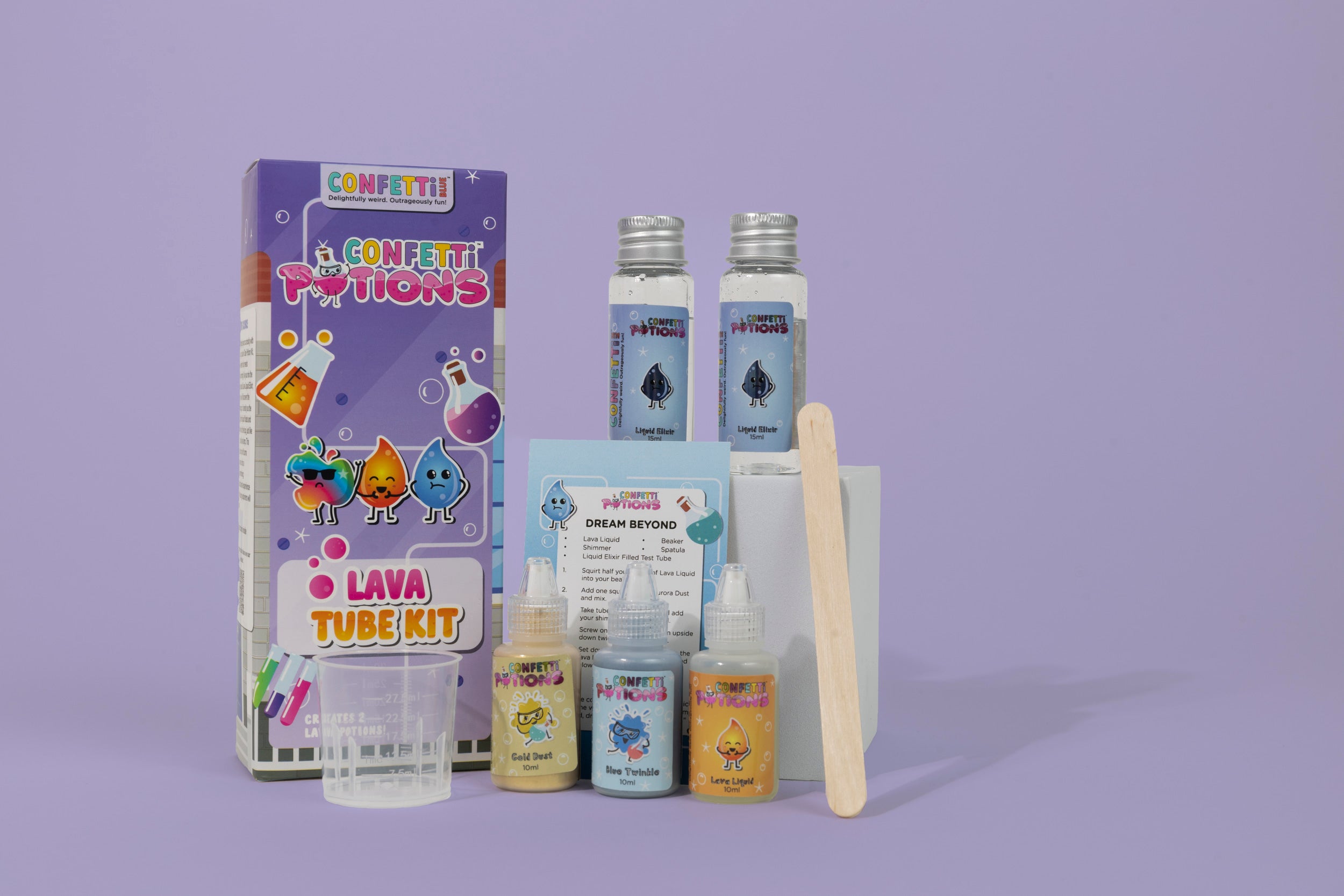 Includes: 2 x Elixir Tubes, 2 x Aurora Dust, 1 Lava Liquid, 1 Beaker, 1 Spatula