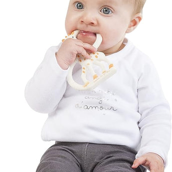 Ideal for soothing painful gums with natural teething ring. The two rings have different textured surfaces for baby to choose from according to his age and needs, to give even faster relief for aching gums.
