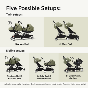 Whether your children have a small age gap or are twins, the stroller comes with up to 5 different possible setups accompanying them, from birth to toddler.