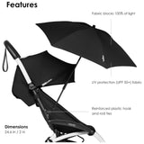 The parasol adapts to all versions of YOYO³ (newborn pack, newborn shell and 6+ pack) and can also clip onto the car seat.,With UPF 50+ protection and enhanced opacity, it protects your baby from the sun more effectively than ever.