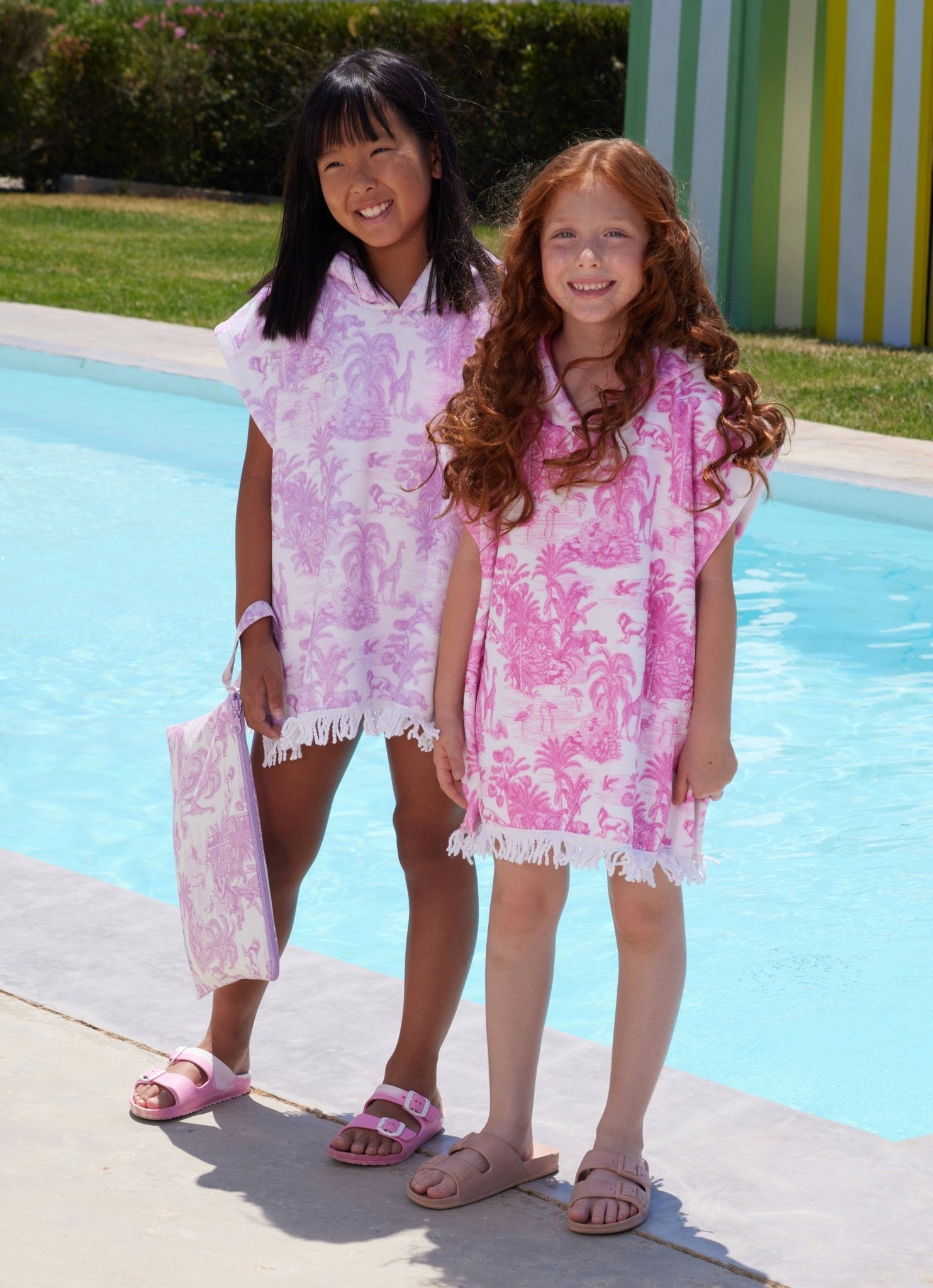 Pink jungle warmth! The Marie Raxevsky Jungle Pink Hooded Terry Poncho wraps girls in soft absorbent terry with jungle pink print. Marie Raxevsky designed this cosy poncho for quick drying after swimming. This Marie Raxevsky poncho keeps girls warm in pink jungle style while drying off after every splash.