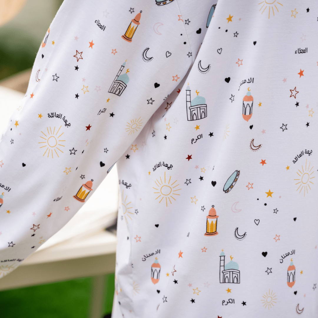 Festive sleep style! The Nohm Ramadan Eid Long Sleeve Pyjama features fun Ramadan and Eid themed graphics for celebrating kids. Nohm designed this cosy pyjama set for festive bedtimes and family celebrations. This Nohm sleepwear makes Ramadan and Eid mornings extra special with comfortable, themed nightwear kids adore.