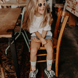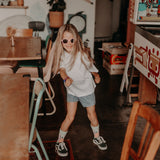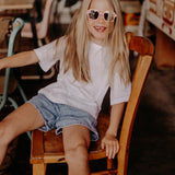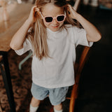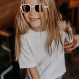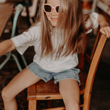The Hossy children's sunglasses will suit all the scoundrels. The Hossy collection is a collection that we particularly like. It is carried by our Jimmy. UV400 protection, Category 3 lenses, recycled polycarbonate, spring hinges, colorful packaging, we have taken care of every detail.